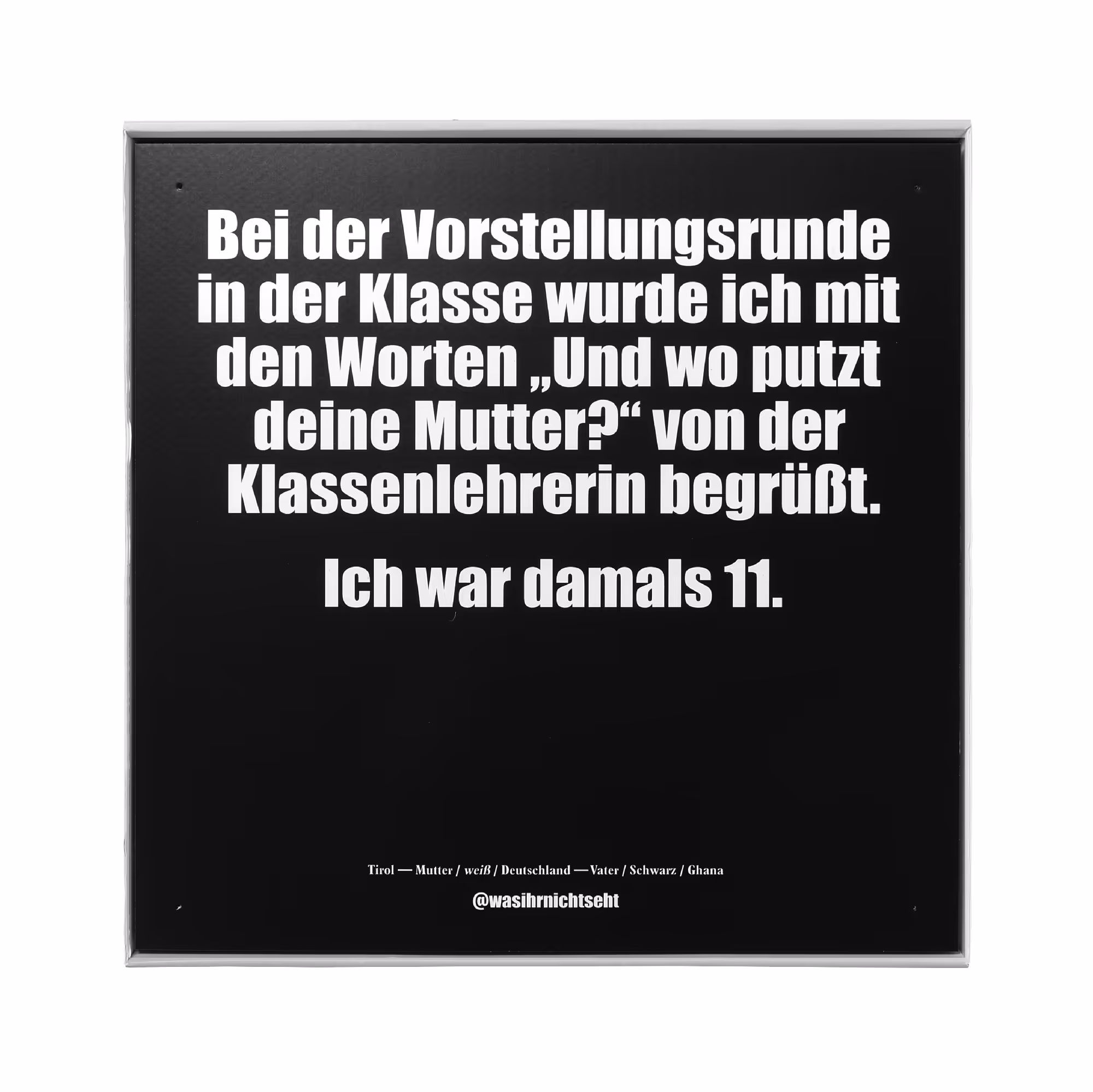 In unserer Pallas Vinyl Lounge kannst Du zwischen dem 20. März und dem 4. April die „WAS IHR NICHT SEHT“-Ausstellung besuchen - der Eintritt ist frei. „Was Schwarze Menschen tagtäglich an Alltagsrassismus erleben, ist vielen weißen Menschen nicht bewusst. Ist man selbst nicht betroffen, nimmt man Dinge oft nicht wahr. Daher der Name “WAS IHR NICHT SEHT”. Mit dem Projekt möchte ich schwarzen Menschen eine Plattform bieten und sie empowern, ihre Erfahrungen zu teilen und so sichtbar zu machen. Gleichzeitig möchte ich Menschen, die nicht von Rassismus betroffen sind, dafür sensibilisieren und zum Nachdenken anregen. Meine Hoffnung ist, dass weiße Menschen verstehen, wie omnipräsent Rassismus nach wie vor ist und wir uns alle gemeinsam aktiv für eine anti-rassistische Zukunft einsetzen“, sagt Dominik Lucha, Initiator der Aktion, der bei Instagram schon mehr als 100.000 Menschen folgen.